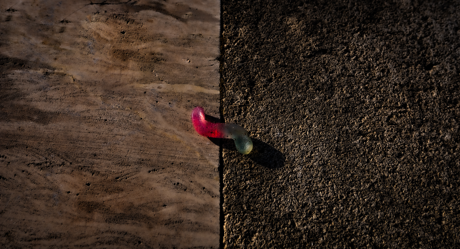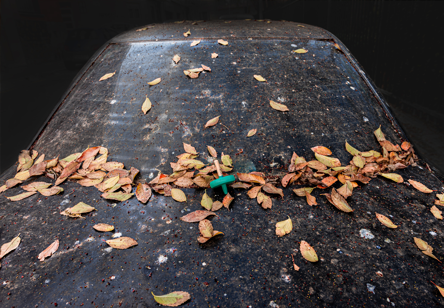 F4824. Bufeta descolorida i semi desinflada damunt un capó vermell. I La rosada mesclada amb la pols forma uns xaragalls que junt amb les cagades estel·lars de l'ocelleria conformen un paisatge sorprenent.