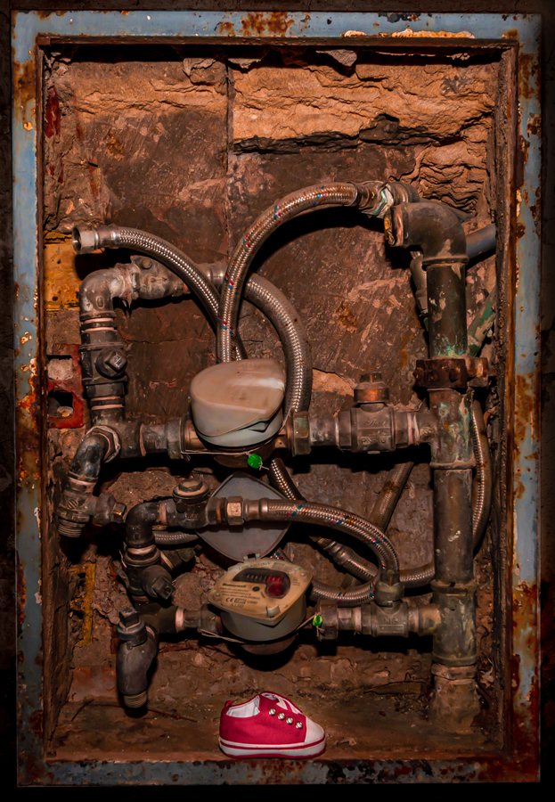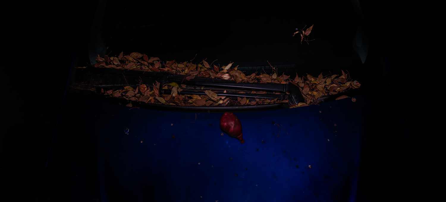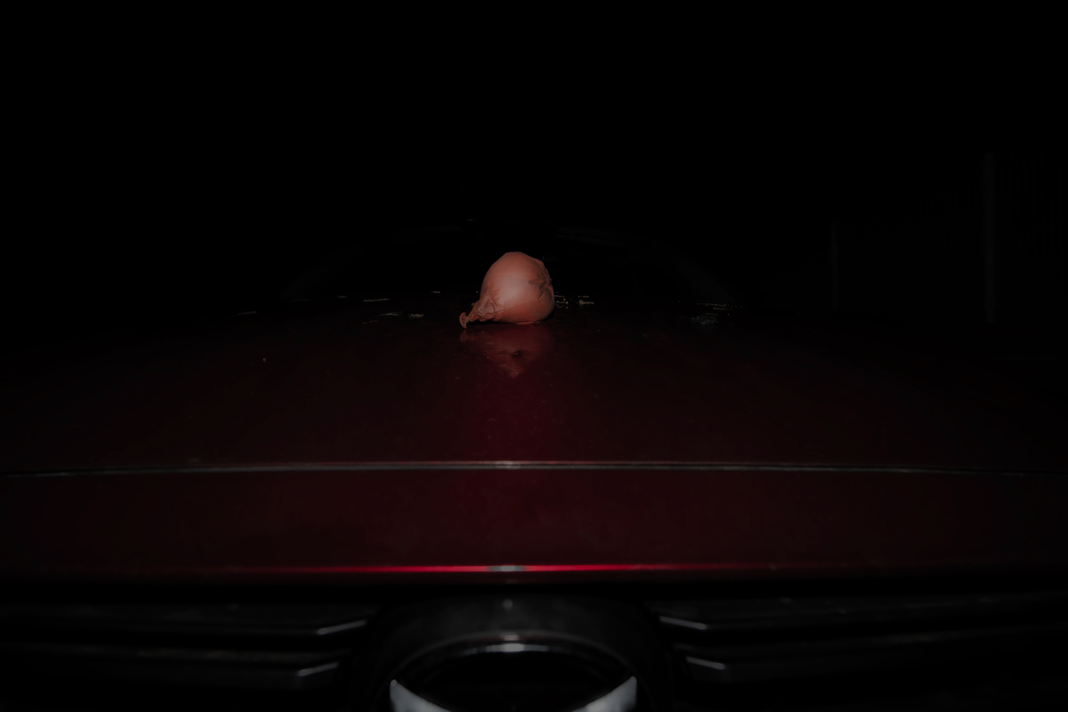 F4829. Bufeta descolorida i semi desinflada damunt un capó vermell. II Un petit canvi en l'angle d'enquadrament i tot varia completament.