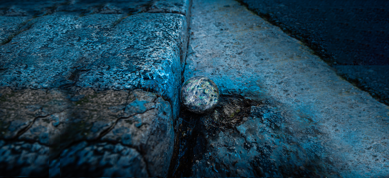 F4835. Bufeta semi desinflada i descolorida i semi desinflada i descolorida damunt un capó blau.
