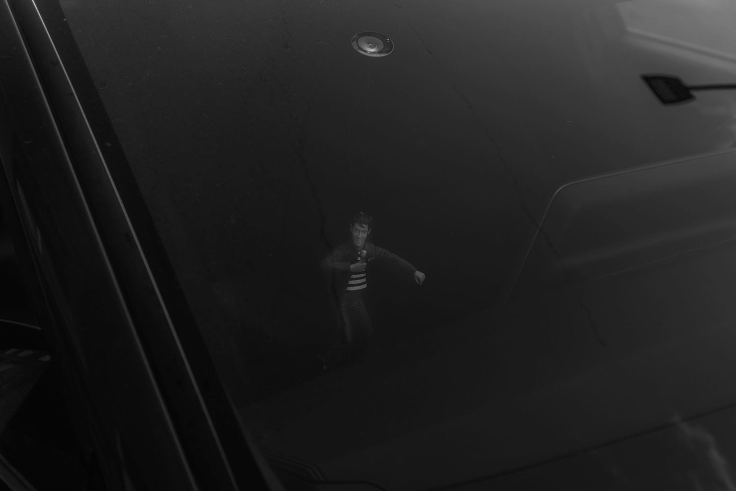 F3940. Bel posa damunt el capó d'un cotxe a l'estil meridional.