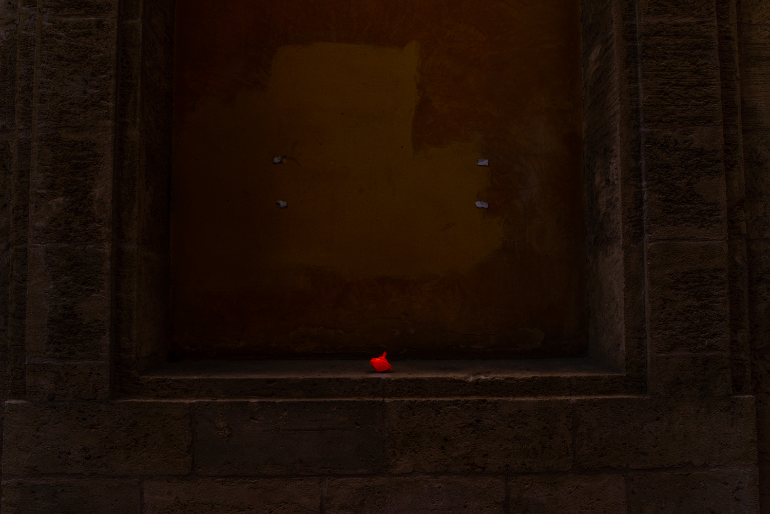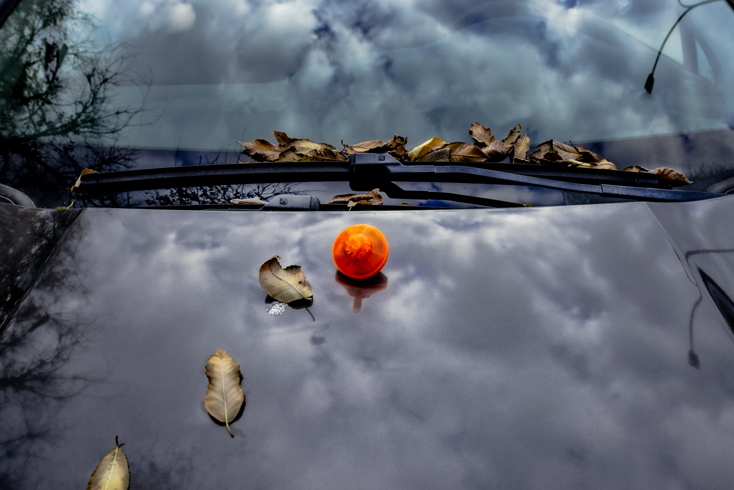 F4829. Bufeta descolorida i semi desinflada damunt un capó vermell. II Un petit canvi en l'angle d'enquadrament i tot varia completament.