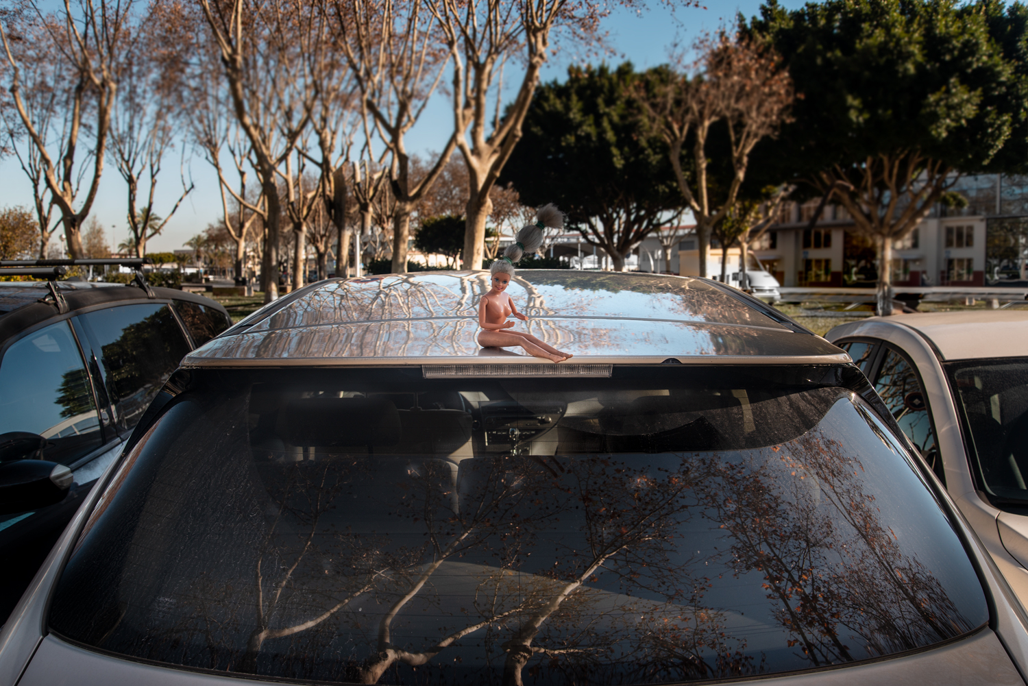 F3940. Bel posa damunt el capó d'un cotxe a l'estil meridional.