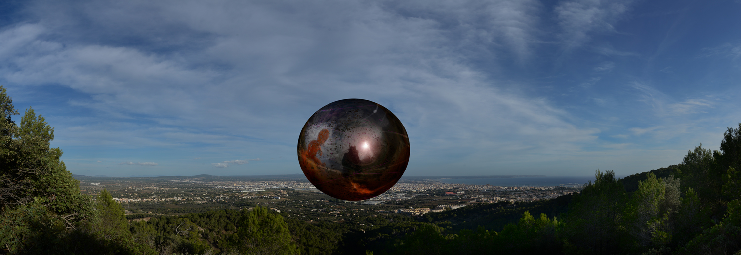F4824. Bufeta descolorida i semi desinflada damunt un capó vermell. I La rosada mesclada amb la pols forma uns xaragalls que junt amb les cagades estel·lars de l'ocelleria conformen un paisatge sorprenent.